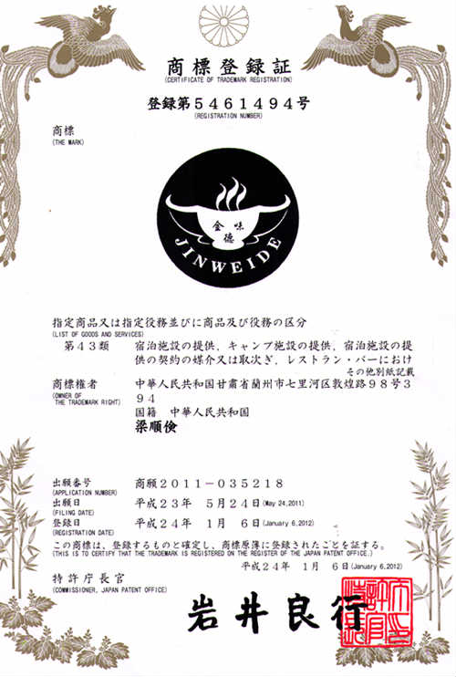 2012年1月6日,甘肅金味餐飲有限公司旗下“金味德”品牌商標(biāo)在日本特許廳的認(rèn)證后,正式獲得在日本的商標(biāo)使用權(quán)。