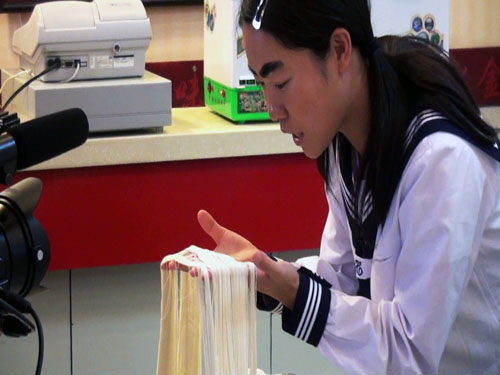 此情此景,伊毛島小姐不敢相信自己的眼睛,反復挑起“面絲”和自己頭發作比較,并感嘆“我們去年看到過您在日本秋田市傳播蘭州牛肉拉面文化時的報道,覺得很不可思議。一團面怎么就可以拉出像頭發絲粗細的面條呢?所以今天我們特意從日本趕來,想親眼目睹奇跡是怎樣在您手上誕生的!