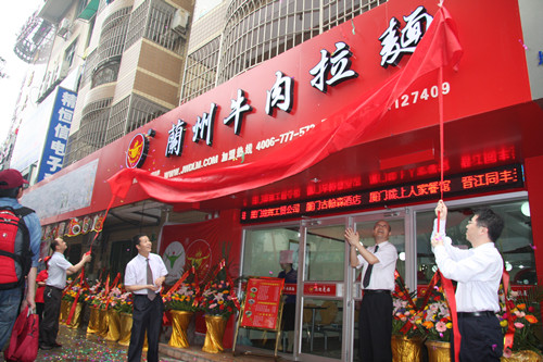 廈門市政府接待辦主任、蘭州市駐廈門辦事處主任、廈門江頭街道辦事處主任、甘肅金味餐飲有限公司董事長共同為福建廈門金味德蘭州牛肉拉面店揭牌