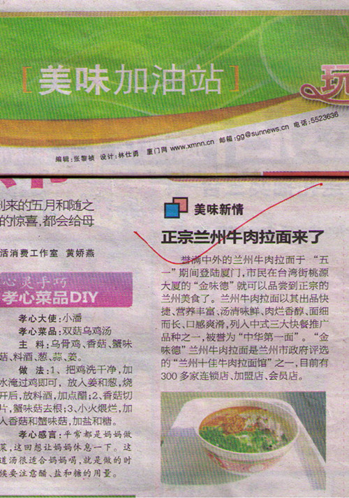 金味德蘭州牛肉拉面成功在廈門登陸后,經(jīng)過半個(gè)月的運(yùn)營(yíng),由于是金味德蘭州正宗牛肉拉面,立刻在當(dāng)?shù)匾疝Z動(dòng),每天來品嘗的食客絡(luò)繹不絕,有時(shí)甚至要排幾十分鐘隊(duì)才能吃到一碗美味的牛肉拉面。各大報(bào)紙爭(zhēng)相報(bào)道廈門店的盛況,尤其是對(duì)這種蘭州傳統(tǒng)飲食的制作流程和制作方法特別關(guān)注,眾所周知蘭州牛肉拉面在世界都是有名的,尤其是金味德“一清二白三紅四綠”的配料過程和純天然無公害的牦牛肉,尤其是在現(xiàn)在都有著非常高的飲食健康追求,蘭州牛肉拉面無疑是最好最健康的首選飲食。