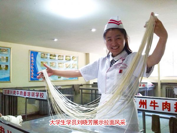 大學生之二 ____ 劉曉芳,甘肅民勤縣的一名九零后女大學生,在天津天獅學院主修食品科學與工程專業的她對餐飲有極大的興趣。剛走出校園的她對未來很迷茫,偶然的機會,她在電視上看到蘭州廣電總臺播出的蘭州牛肉拉面系列節目,她的熱情一下被點燃了,現在的她已是大學生免費培訓班的一名正式學員。她希望通過這幾個月的學習自己能真正掌握一項有特色的一技之長,走上自主創業的道路,投身自己喜歡的行業。