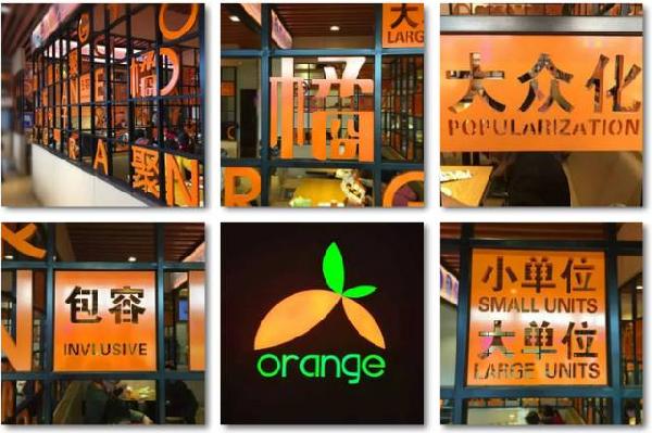 經過細致分析設計,并提出創意方案,設計師為“橘子”餐廳打造了一個以黑色背景為主題,綠色、橙色兩種色彩構成簡潔LOGO,“橘子”LOGO和背景色澤形成超級色彩反差,將“橘子”LOGO變成了店鋪的超級標簽。利用燈光加亮的效果,最后從商場的各個角度都能非常明顯的看到“橘子”餐廳的LOGO,這一創意設計成功占領了消費者的眼光。