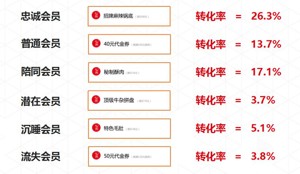 我們說了那么多活動,我們的會員積累、會員維護,最終目的都是想通過消費者的消費行為對消費者進行畫像。大家都知道每個人都有他獨特的口味。有些人喜歡吃辣,有些人喜歡吃酸,每個人都有不同的消費體驗。得到這些數據之后,就可以對消費者進行分類。分類的目的是為了更好的精準營銷,為營銷做決策。忠誠會員,肯定是要提升客單價,因為他對你的口味是非常熟悉的。在最合適的時間選擇最酷的呈現方式,送上他最愛吃的美食。