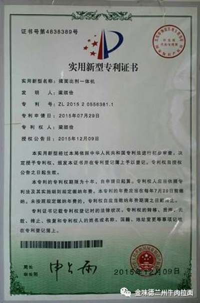 近年來,蘭州牛肉面產業化發展被提上了日程,備受矚目。然而,產業化發展,必須實現機械化。正當牛肉面人為之發愁的時候,中國烹飪大師、甘肅興隴蘭州牛肉拉面職業培訓學校校長梁順儉率先邁出了第一步,研究發明出了“興隴”揉面出劑一體機,這是蘭州拉面史上一次全新的嘗試與改革,將極大推動蘭州牛肉面的發展。