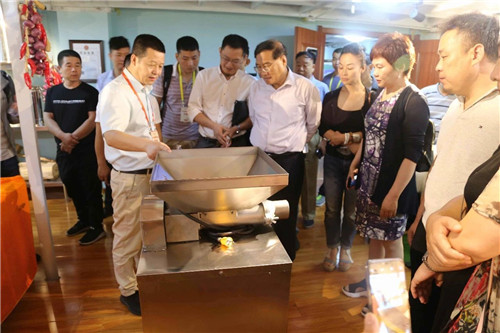 嘉賓在金味德產業集團產業鏈之一的牛大師電子商務有限公司考察交流,了解了由興隴蘭州牛肉拉面廚房設備有限公司專利發明的揉面出擠一體機,同時肯定了它給牛肉面行業帶來的便利。