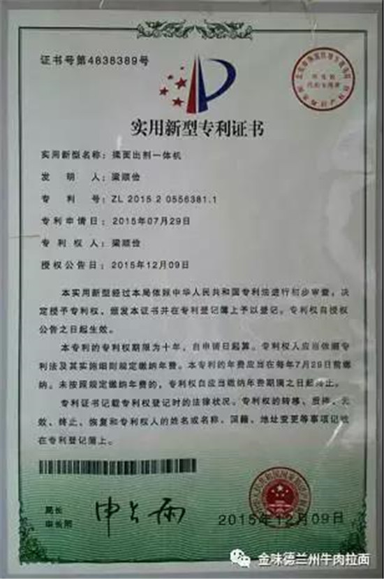 近年來,蘭州牛肉面產業化發展被提上了日程,備受矚目。然而,產業化發展,必須實現機械化。正當牛肉面人為之發愁的時候,中國烹飪大師、甘肅興隴蘭州牛肉拉面職業培訓學校校長梁順儉率先邁出了第一步,研究發明出了“興隴”揉面出劑一體機,這是蘭州拉面史上一次全新的嘗試與改革,將極大推動蘭州牛肉面的發展。 揉面出劑一體機專利證書