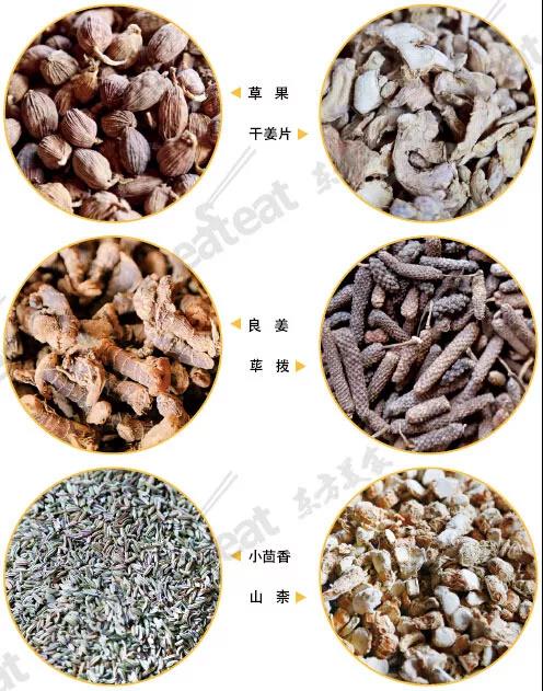 煮肉(湯)調料配比:花椒18%,干姜片20%,草果、肉桂各10%,山柰、肉蔻各5%,白胡椒9%,小茴香12%,香草、良姜各4%,蓽撥3%,煮肉料比湯的投放比例根據口味濃淡大概為0.5%-0.7%。