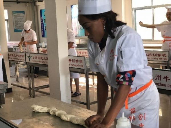 在甘肅興隴蘭州牛肉拉面職業培訓學校里,來自尼日利亞的蘭州大學漢語國際教育專業碩士金佑琪正跟老師學習拉面。借助暑期,她有大量時間不斷重復抻拉動作,以求快速地將面拉得更均勻。