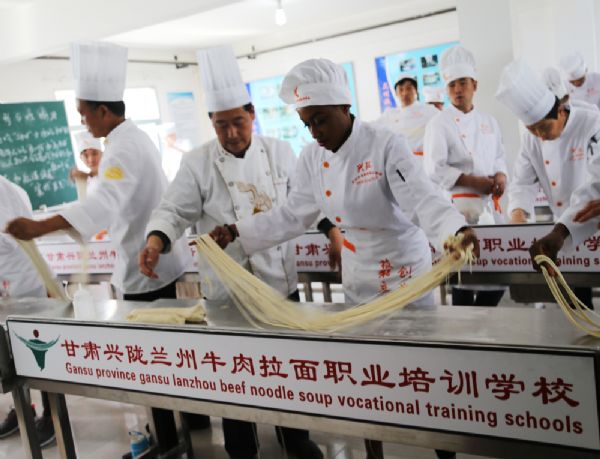 2018年4月11日,來自哈薩克斯坦、澳大利亞等國學員在甘肅興隴蘭州牛肉拉面職業培訓學校學習牛肉面制作工藝。