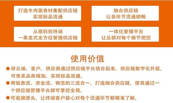 食材供應鏈平臺對商品的生產、流通與銷售過程進行升級改造及標準化管理,進而重塑業態結構與生態圈。建立在面向下游終端客戶的配送體系,以提高物流效率、降低物流成本為目的配送全過程的標準化體系,以運用物聯網、大數據等技術現代化蘭州牛肉拉面信息線上綜合型、專業型服務平臺,實現供應鏈共享運輸資源、牛肉面技術資源的承運體系,最終達到降低終端牛肉面食材成本10%左右。