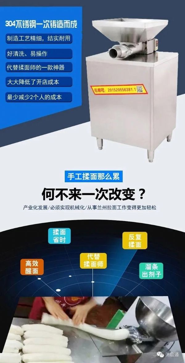 主要用于代替蘭州牛肉拉面、饸饹面、河南燴面、扯面、山西刀削面、福山拉面、西安油潑面等面團(tuán)的人工揉制環(huán)節(jié),省時(shí)省力效率高,面團(tuán)密度增加,面條口感更加筋道、耐泡,還廣泛用于饅頭店、餅子店、蛋糕店、手工面食店等,可以同時(shí)節(jié)省兩個(gè)人力,把人從和面、揉面中解放出來。