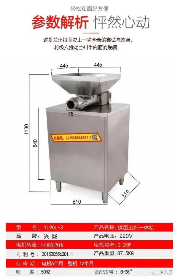 “興隴”揉面出劑一體機(jī)的問世,無疑是蘭州拉面史上一次全新的嘗試與改革,將極大推動(dòng)蘭州牛肉面的發(fā)展。解放人手、提高效益,一臺(tái)機(jī)器能讓您省下2個(gè)人工,能讓拉面店老板省錢省力還省心。