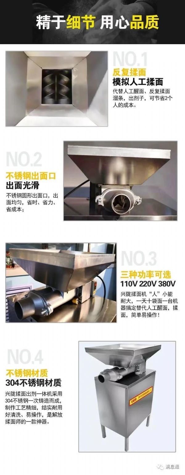 這款揉面出劑一體機(jī)參照手工揉面、溜條、出劑的過程研發(fā)而成,既可以揉面,同時(shí)可以制作出拉面的面劑子。