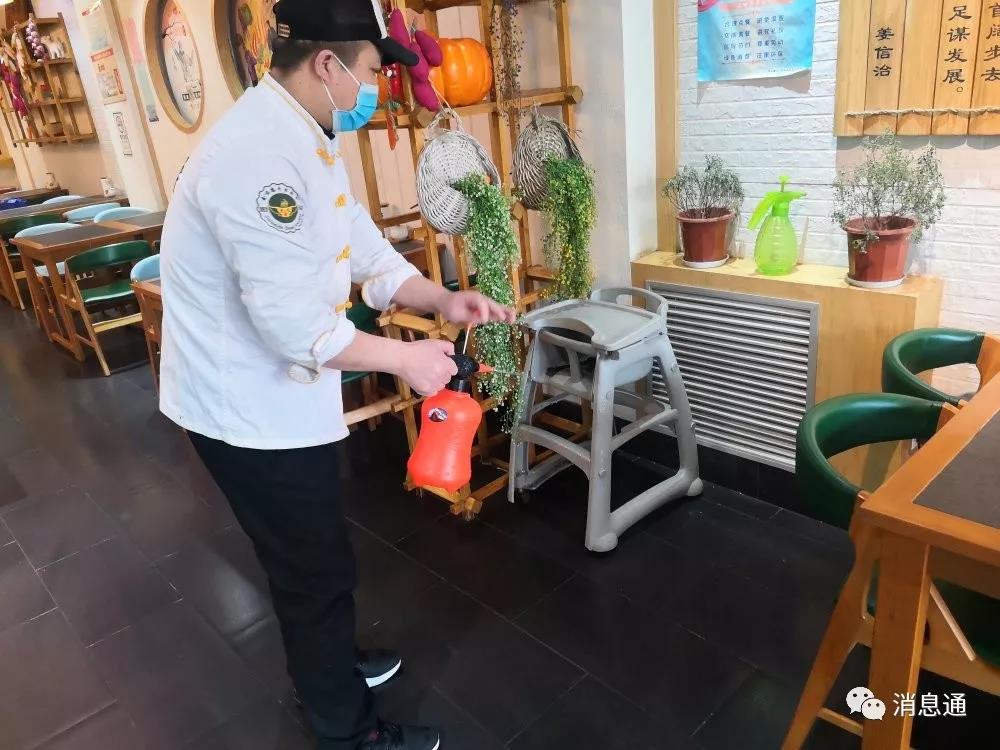 4、餐廳在開始營業前已經進行了3天的消毒,在營業時定時專人噴撒消毒。