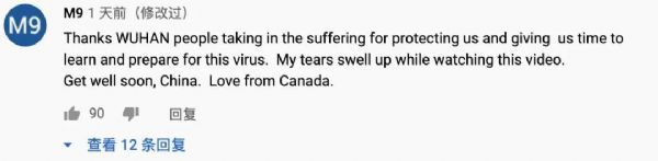 英國網友Bernadine Sarah W評論:“感謝這部紀錄片,它為我們提供了抗擊疫情的寶貴經驗。非常感謝武漢人民用他們的獻身精神阻止了病毒進一步傳播。我們應該向他們學習。感謝武漢人民。”