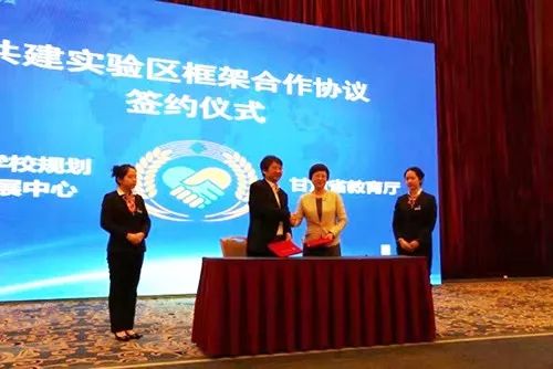 教育部學校規劃建設發展中心主任陳鋒與甘肅省委教育工委書記、省教育廳廳長王海燕共同為“甘肅省農校對接精準扶貧實驗區”揭牌。教育部學校規劃建設發展中心與甘肅省教育廳簽署共建實驗區合作框架協議、與建行甘肅省分行等企業簽署農校對接精準扶貧戰略合作協議。