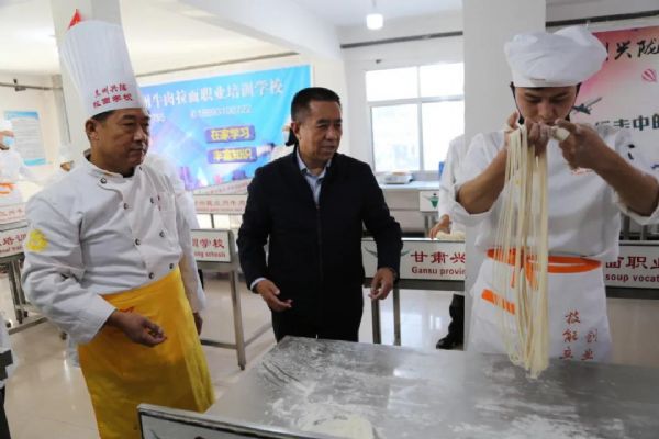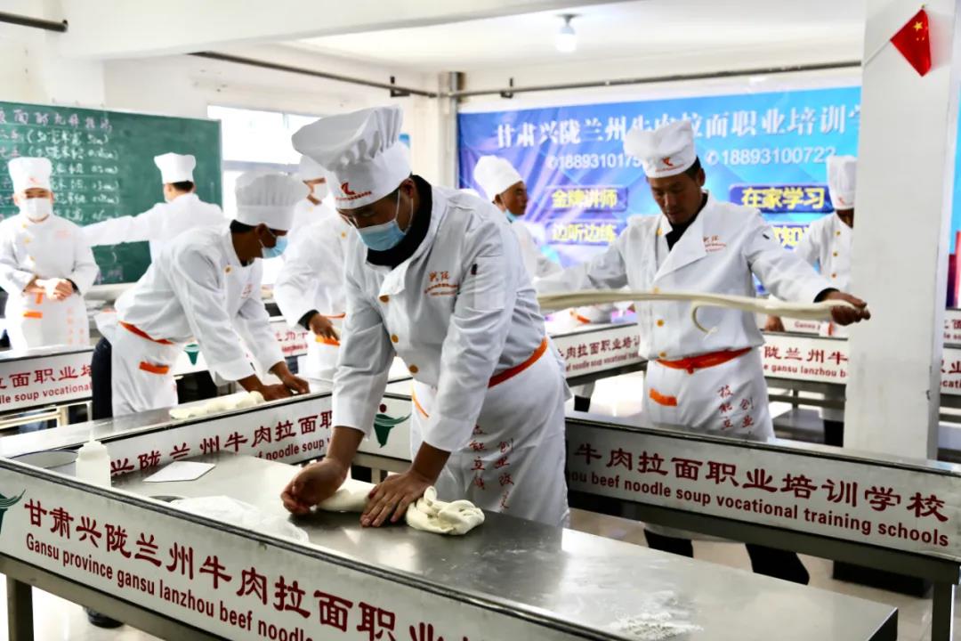 2020年10月22日,走進蘭州牛肉拉面行業協會會員單位創辦的興隴蘭州牛肉拉面職業培訓學校,記者看到來自甘肅不同地區的學員們正在拉面老師的指導下認真學習拉面技術。培訓學校校長梁順儉介紹,這次培訓是由蘭州牛肉拉面行業協會推動,與甘肅省商務廳合作推出的拉面技能培訓活動,是助力脫貧攻堅的重要舉措,招收的學員均為建檔立卡貧困戶。