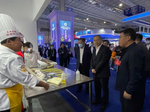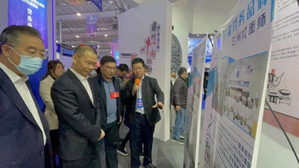 人社部副部長(zhǎng)在甘肅省人社廳領(lǐng)導(dǎo)陪同下考察甘肅勞務(wù)品牌展廳,參觀中國(guó)勞務(wù)品牌甘肅蘭州拉面師展位