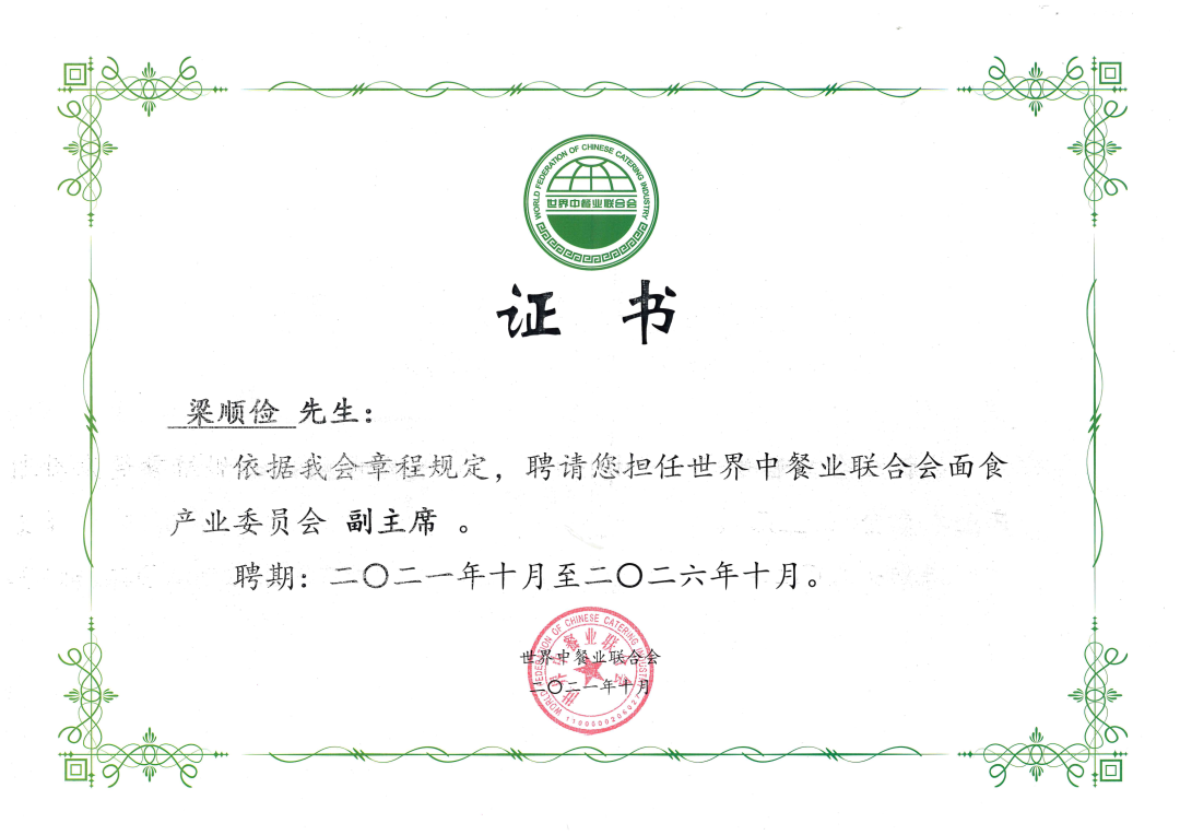 蘭州牛肉拉面國際聯盟主席、甘肅省烹飪協會副會長、蘭州牛肉拉面行業協會副秘書長、蘭州市人民對外友好協會副會長、平涼饸饹面行業協會會長、蘭州烹飪協會副會長、興隴蘭州牛肉拉面國際商學院副院長、甘肅興隴蘭州牛肉拉面職業培訓學校校長、《蘭州牛肉拉面寶典》主編、金味德拉面文化產業集團董事長、蘭州資源環境職業技術學院客座教授、興隴蘭州牛肉拉面國際商學院副院長、蘭州金藍領領軍人才、梁順儉蘭州牛肉拉面大師工作室首席大師、蘭州市旅游協會副會長,被世界中餐業聯合會聘請為世界中餐業聯合會面食專業委員會副主席,并被授予““面食產業大工匠”榮譽稱號。