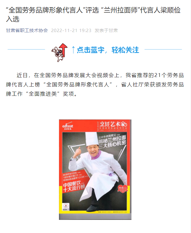 梁順儉先生耕耘蘭州拉面職業培訓14年,累計面向國內外培訓牛肉拉面人才達4萬多人。長期致力于蘭州牛肉拉面文化傳播事業,先后于2009年、2010年兩次擔任蘭州牛肉拉面文化技術交流大使赴日本交流傳播飲食文化;2011年7月代表全國總工會在廈門參加海峽兩岸職工論壇,2013年在美國華爾街交流蘭州牛肉拉面文化。接待來自全國百強餐飲連鎖企業代表、財政部、人社部、商務部等政府、全國行業協會考察團。