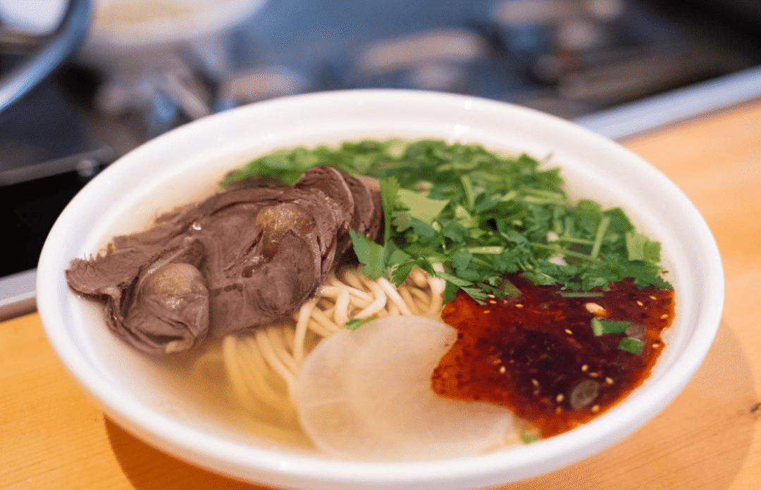 “一清”是指牛肉湯色清潔凈,氣味香濃。“又見壹面”的拉面湯底由八塊牛棒骨、四塊牛膝蓋骨以及三只雞慢火熬制八小時以上而成,再歷經一遍遍過濾后打掉血水和嘌呤物,最終,一碗健康而又色澤清澈的牛肉湯就做好了。