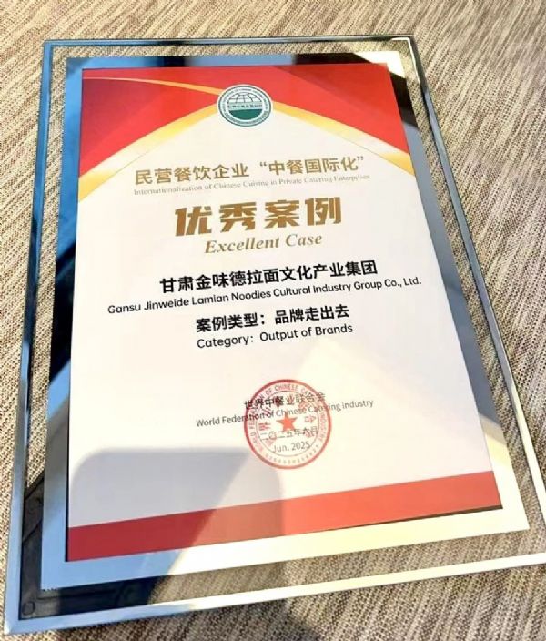 活動現(xiàn)場,“中餐國際化優(yōu)秀案例” 正式揭曉,甘肅金味德拉面文化產(chǎn)業(yè)集團憑借蘭州牛肉拉面國際化的標桿實踐榮耀上榜,成為中式快餐品牌引領(lǐng)“中餐出海”的標桿,為中華飲食文化走向世界注入強勁動力。